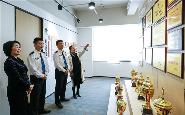 杭州市公安局钱塘新区分局党委委员、副局长蒋晓敏及办公室、经文保(国保)大队、法制(预审)大队、白杨派出所相关负责人,学院执行院长黄爱平,党委副书记、副院长谢鑫,院长办公室、学生处、保卫处、宣传信息处负责人陪同调研。