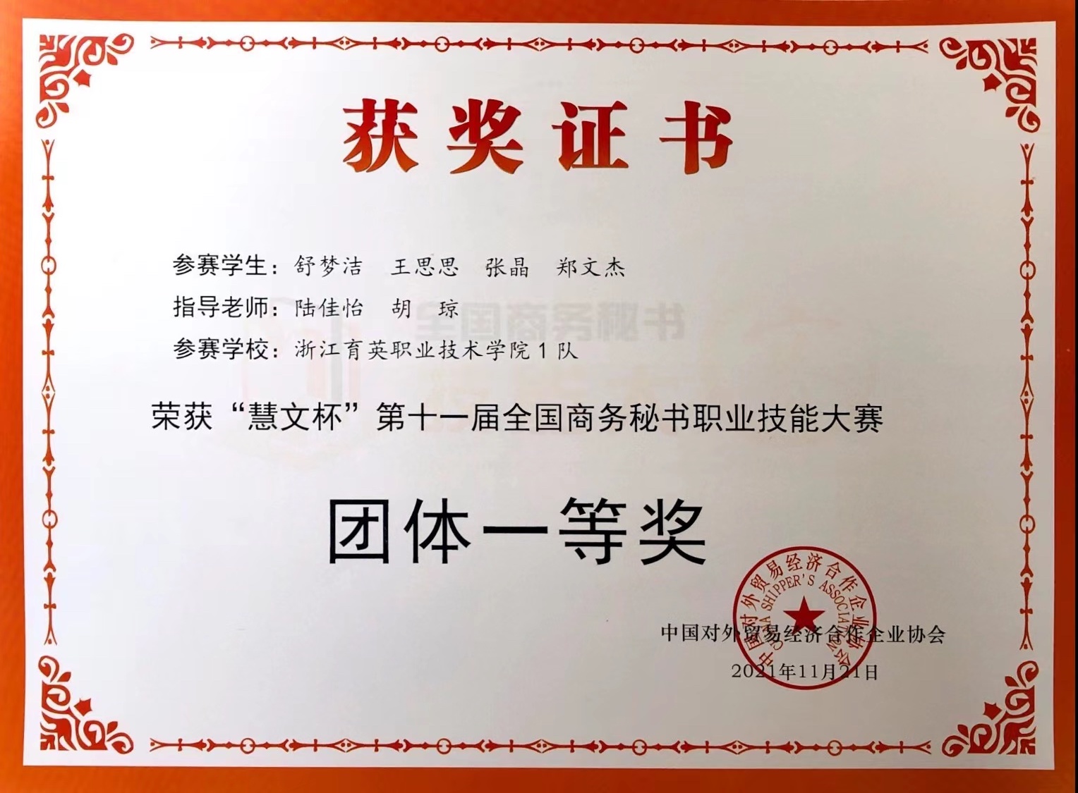 “慧文杯”第十一届全国商务秘书职业技能大赛于2021年11月20日通过“线下”“线上”结合的形式隆重举行,我院文秘专业8人组成2支参赛队参赛并获奖。其中19文秘舒梦洁、20文秘郑文杰、20文秘王思思、20文秘张晶获团体一等奖,19文秘袁宇轩、20文秘肖慧、20文秘金笑莉、20文秘杨欣逸获团体二等奖。指导老师陆佳怡、胡琼、王亦飞。