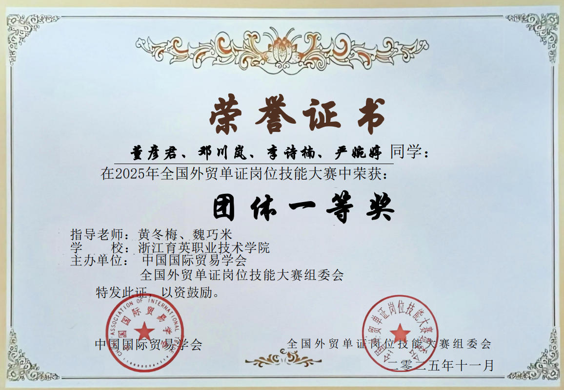 本届赛事共吸引全国各省市自治区高校的387支队伍报名。经选拔与成绩审核,最终216支队伍晋级全国总决赛。数智商贸学院国际商务专业积极备赛,在傅祝屏、黄冬梅、魏巧米三位教师的指导下,来自24级与25级国际商务专业的四支团队、共16位同学凭借扎实的专业基础、灵活的应变能力和密切的团队协作,历经多轮外贸单证实操考核,从全国选拔赛到全国总决赛均表现优异,最终斩获全国总决赛团体一等奖3项、团体二等奖1项,为学校赢得荣誉,展现了商贸学子的卓越风采。