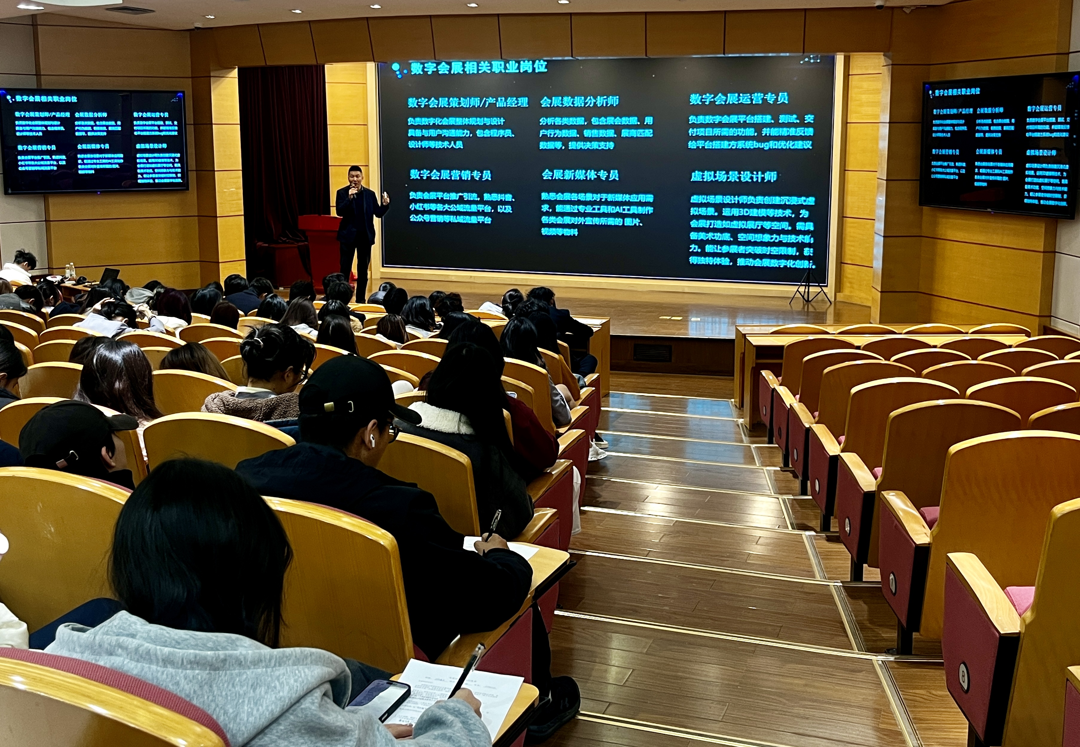 2025年11月26日上午,智慧旅游学院会展策划与管理专业25级新生岗位认知考察会展数字化专题讲座在三号楼三楼报告厅顺利举行。本次讲座由会展专业傅晶老师主持,特邀杭州准到信息科技有限公司总经理陈洋担任主讲,以《会展数字化:趋势、实践与未来职业新蓝图》为主题,为25级会展专业全体学生及24会展A班学生带来了一场内容丰富、视野前沿的专业讲座。