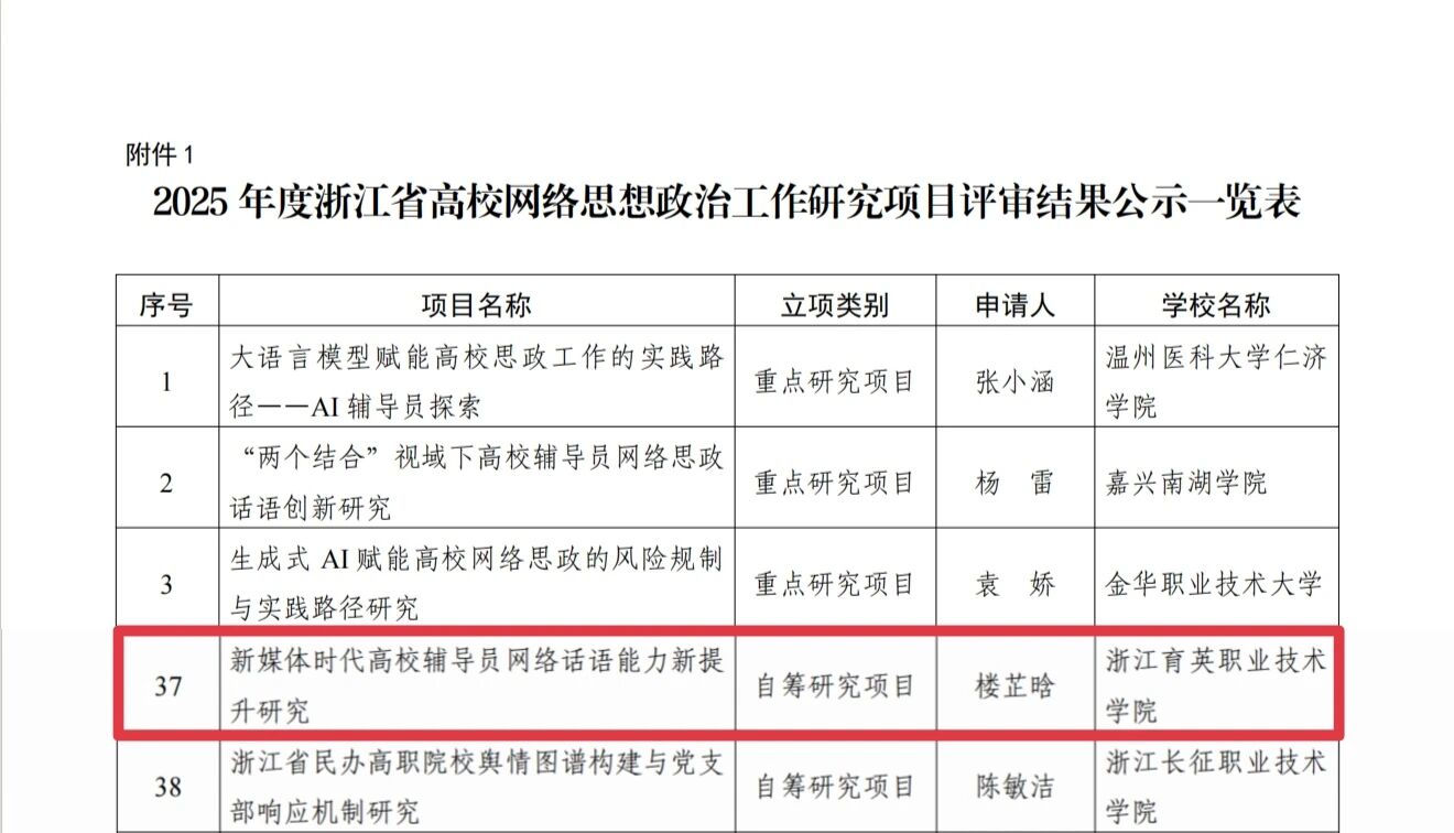 近日,浙江省教育厅宣传教育与统战处、浙江高校网络思想政治工作中心联合公布了2025年度浙江省高校网络思想政治工作研究项目立项名单。我校数智商贸学院楼芷晗老师主持的《新媒体时代高校辅导员网络话语能力新提升研究》(项目编号:ZC-14)成功入选。