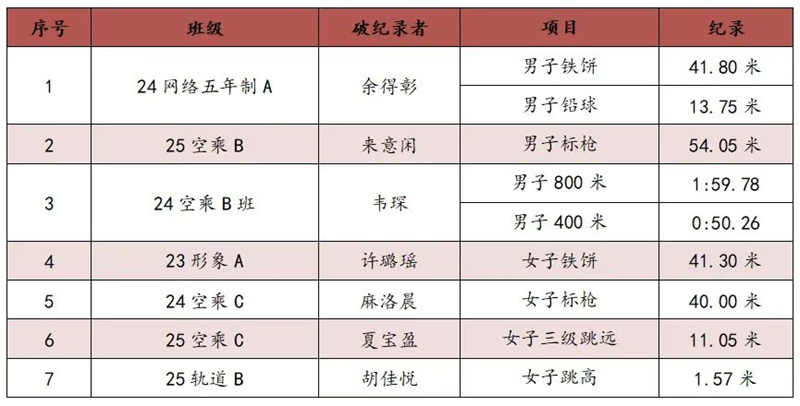 本次运动会以班级为单位参赛,共设男子项目13项,女子项目13项,混合接力1项,参赛班级代表队156个,参赛学生运动员达1700人以上,7人破学校田径运动会9项成绩纪录。参赛教工运动员约400余人次。