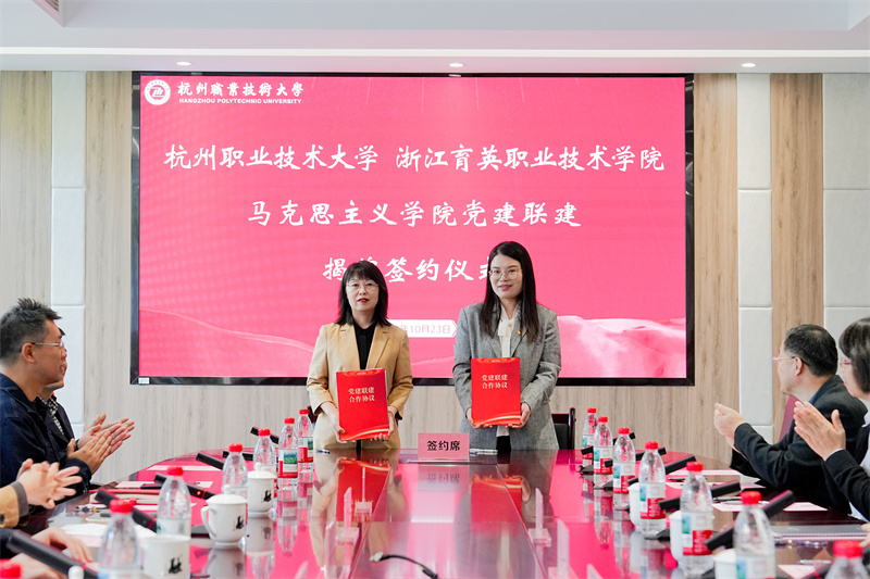 10月23日,两校马克思主义学院党建联建揭牌签约仪式在杭职大马克思主义学院举行。杭职大党委副书记赖明诚,组织部部长韩亮、宣传部部长张杰、马院党总支书记、院长邹宏秋,我校党委书记、副校长谢鑫,党委委员、党群部部长王贤军,马院党总支书记、院长陈贤平出席,两校马院全体教师参会。韩亮主持会议。