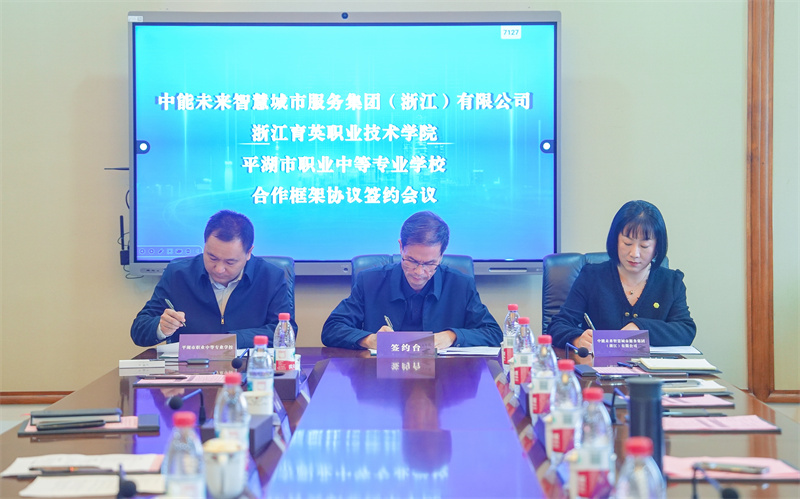 浙江育英职业技术学院校长丁金昌,副校长徐晓斌,中能未来智慧城市服务集团(浙江)有限公司总裁方芳,平湖市职业中等专业学校校长蔡立柱出席签约仪式,三方相关领导及师生代表见证签约。
