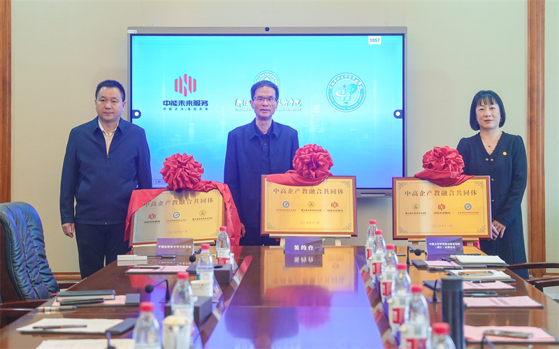 三方签约代表共同签署合作框架协议,三位领导共同为“中高企协同育人基地”揭牌。