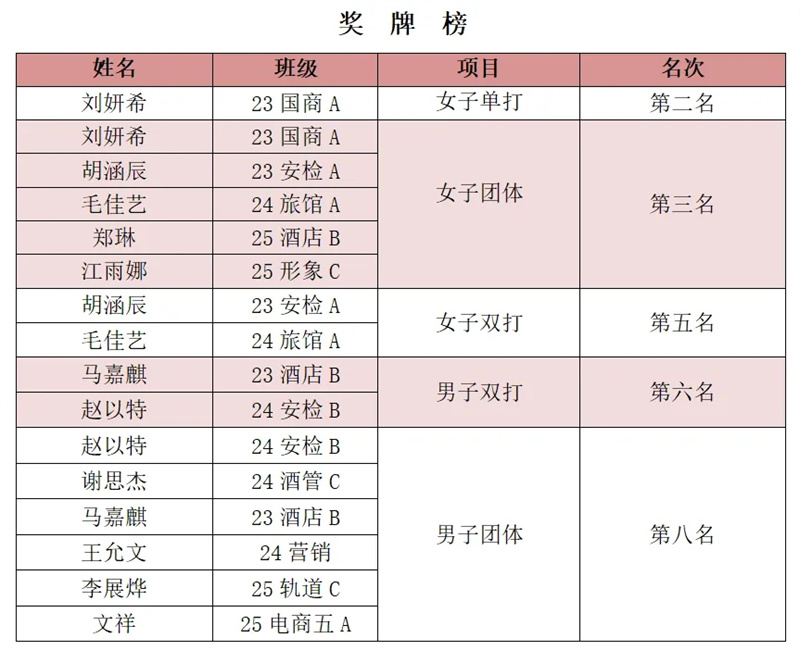 赛场上,每一次挥拍都凝聚着汗水与信念,每一场对决都展现着坚韧与执着。我校女子团体步步为营、稳扎稳打,凭借默契配合与过硬实力一路过关斩将,以小组第一出线,并在第二阶段赛事中挺进三甲。男子团体面对强劲的对手,敢打敢拼,以小组第二出线,经过艰苦拼搏,最终获得第八名。