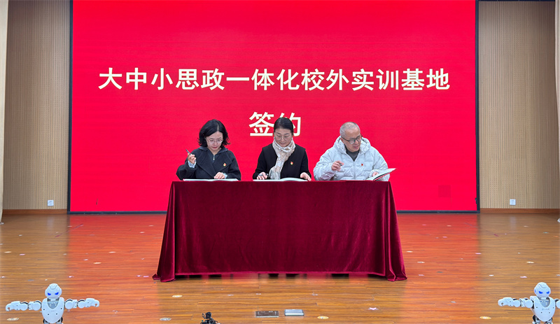 谢鑫与吴顺良、张鑫凤共同为思政教育一体化校外实训基地签约授牌。