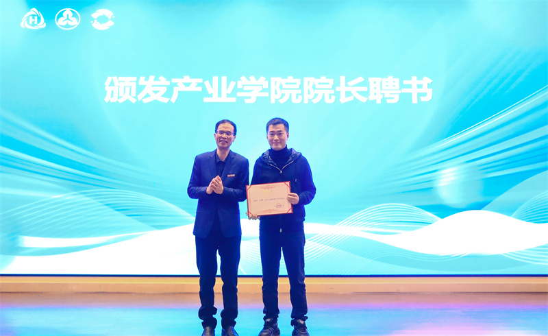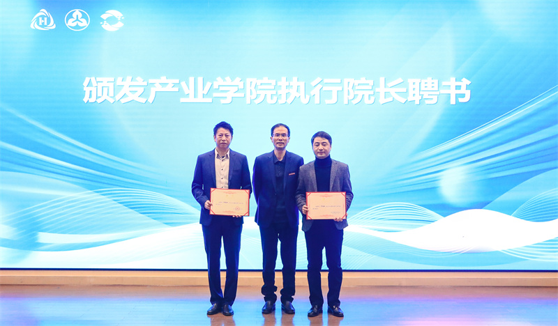 丁金昌为方剑颁发产业学院院长聘书,为李信赢、欧阳驹颁发执行院长聘书。