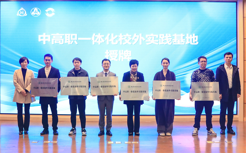 严志嘉、罗妮娜为遥望科技、谦寻控股等六家企业授“中高职一体化校外实践基地”牌匾。