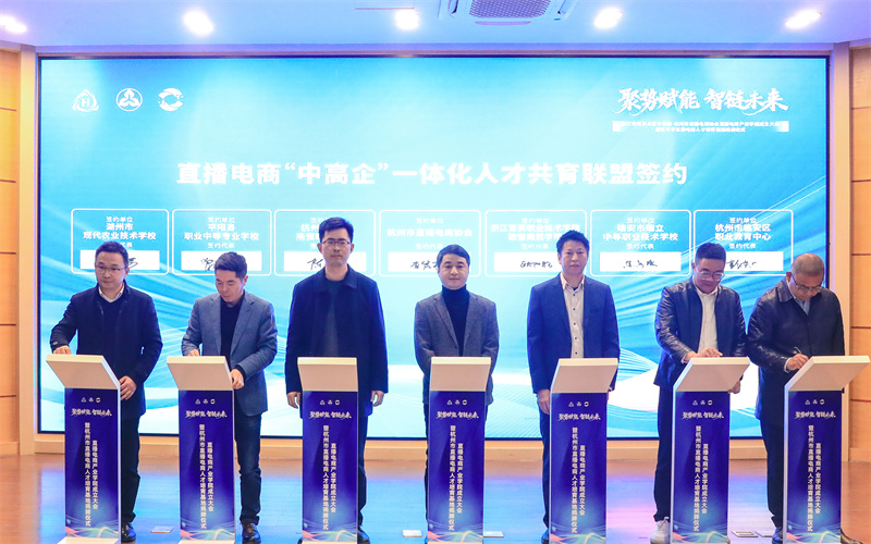 五所中职学校领导与院校、协会代表共同签约,成立直播电商“中高企”一体化人才共育联盟,构建起贯通式人才培养通道。