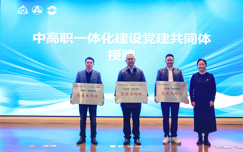 谢鑫为三所中职学校授“中高职一体化建设党建共同体”牌匾,以党建引领人才培养协同发展。