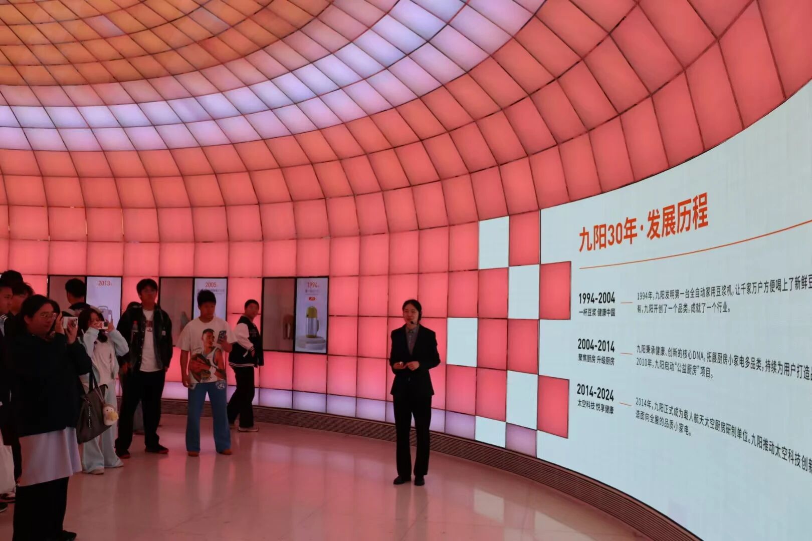 在九阳品牌体验馆,大家依次参观了“时代明星产品”展区和“三个厨房”主题空间。从第一台全自动豆浆机到最新款的智能破壁机,一件件“明星产品”串联起九阳从创立至今的创新足迹。“家庭厨房”“公益厨房”与“太空厨房”三大场景,让同学们直观感受到科技如何融入日常,甚至助力中国空间站航天员的饮食保障。