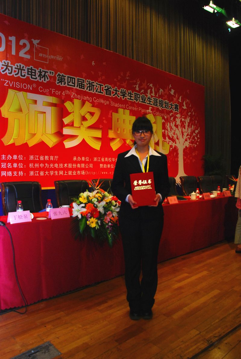 10月31日,第四届浙江省大学生职业生涯规划大赛颁奖典礼在中国计量学院隆重举行。我院6名参赛选手在这次大赛中表现出色,成绩显著。11会展班周韫荣获高职高专组职业规划类一等奖(个人总分第一),被授予“2012年浙江省最佳职业规划之星”荣誉称号,指导教师南佳、吕菱被授予“优秀指导教师”称号;11广告A班王欣怡、10广告C班刘百春、11市场营销B班谭冰分别获得高职高专组创业规划类二等奖;11国贸D班陈昕妤获得高职高专组职业规划类三等奖;11空乘A班李清清获得高职高专职业规划类优胜奖。我院荣获第四届浙江省大学生职业生涯规划大赛“最佳组织奖”。