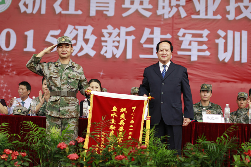 9月28日,毛毛细雨中,浙江育英职业技术学院2015级新生完成为期15天的军训,各连队依次在田径场列队接受检阅。院长洪致平,党委书记、常务副院长、军训团政委王锡耀,73021部队直工科科长房凯,副院长黄爱平,党委副书记、院长助理、军训团副政委谢鑫,院长助理、军训团副团长王敏,部队政工组长、少校钱卫军,军训团团长章四海以及各分院系部、相关行政部门负责人在主席台就座。洪致平向73021部队赠送锦旗。