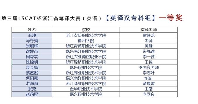 2018年4月20-21日,“LSCAT杯”浙江省笔译大赛在宁波大学举行,我院应用英语专业17英语A班学生张炯辉获英译汉专科组一等奖,17英语A班朱娅丽获三等奖,16英语A班陈若伦获汉译英专科组三等奖,17英语A班林茗茗获三等奖,指导老师为黄静,沈晚笑。