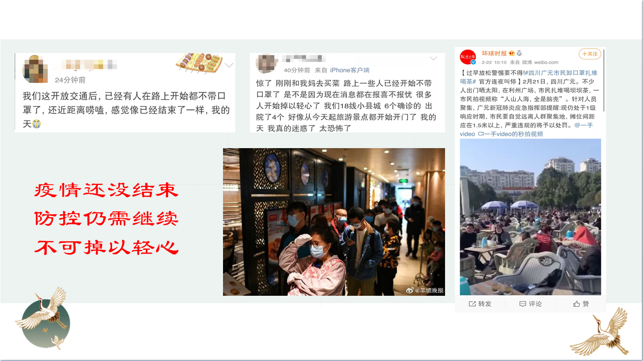 周老师通过一组全国确诊数据和新增确诊病例数的图表,提醒大家:虽然近几日的确诊数据在下降,但并不意味着疫情的结束。越是在疫情发展的关键时刻,越要继续提高警惕,千万不能掉以轻心。科学防治,采取正确的防控措施,少出门、不聚会、外出戴口罩等保护好个人健康。