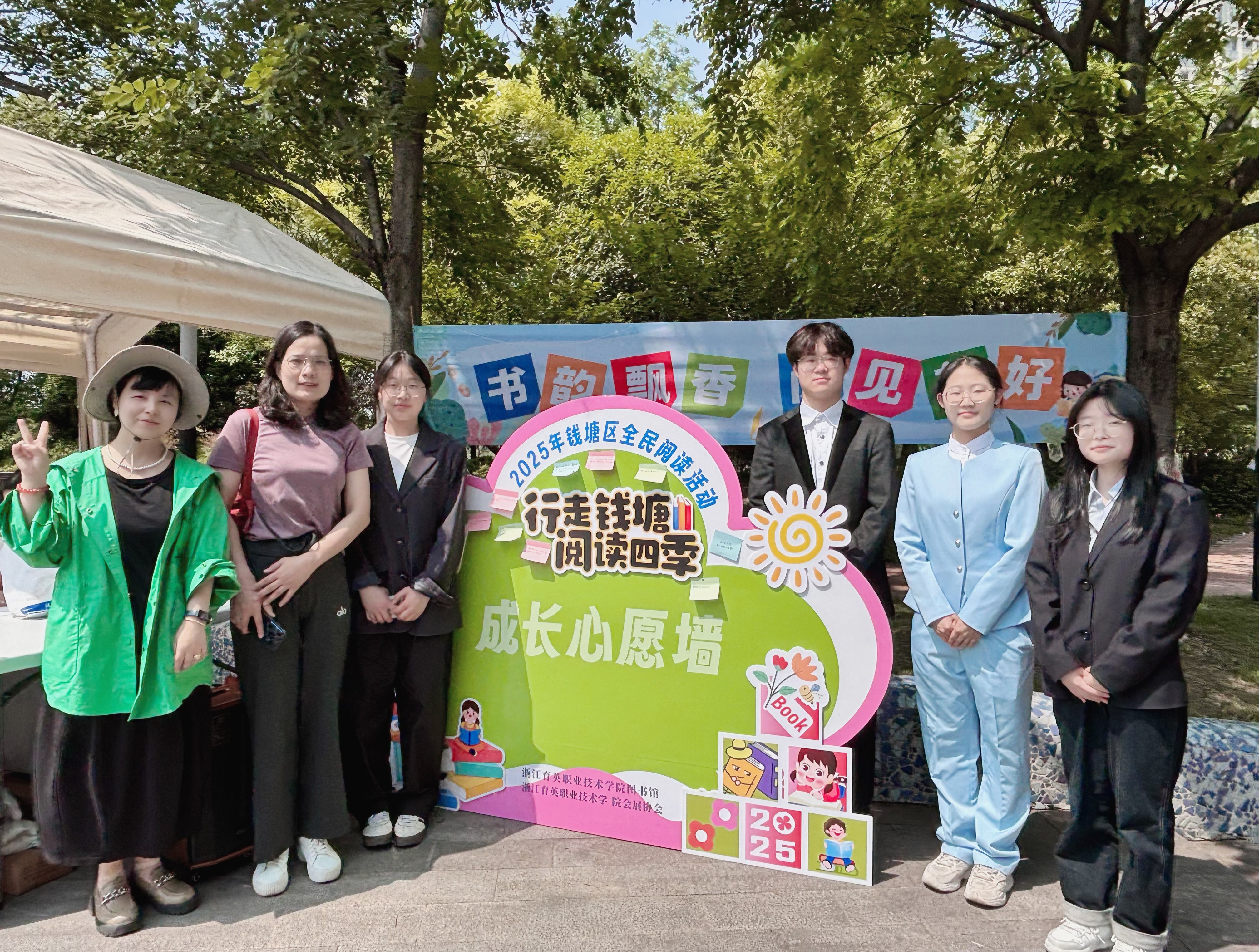 2025年4月23日,正值第30个“世界读书日”,以“行走钱塘,阅读四季”为主题的2025年钱塘区全民阅读活动在杭州市钱塘区听涛小学正式启动。浙江育英职业技术学院作为协办单位深度参与,智慧旅游学院会展策划与管理专业专任教师、会展协会指导老师王贇亲自领队,于当天上午在江滨花园未来社区公园的全民阅读市集中,策划并设立了别具特色的“成长心愿墙”互动摊位,成为活动现场的亮点之一。