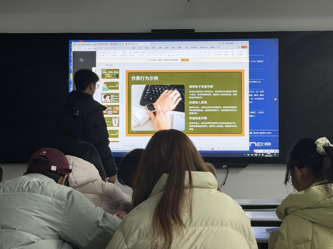 班会尾声,辅导员对本次班会进行总结寄语,强调“诚信考试是底线,诚实做人是底色”,鼓励同学们将诚信品质融入学习生活的方方面面,既要以诚信姿态迎接即将到来的考试,更要以诚实品格走好人生每一步。同时,针对考前心态调节、复习方法等问题,辅导员也给出了具体指导建议,帮助学生以良好状态备战考试。