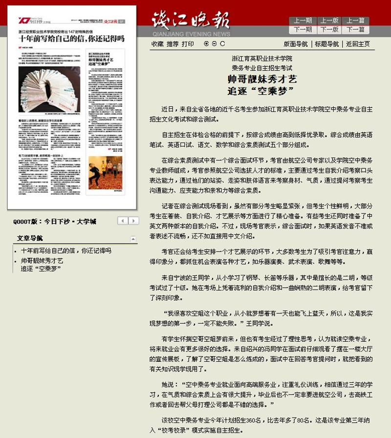媒体看育英 联系我们 地址:杭州市钱塘区4号大街16号 邮编:310018 电话:0571-86911032、86877189 媒体看育英 当前位置:首页 >> 媒体看育英 多家媒体报道我院空乘专业自主招生考试 时间:2016-02-27 《浙江日报》链接 http://zjrb.zjol.com.cn/html/2014-04/11/content_2610081.htm?div=-1 《钱江晚报》链接 http://qjwb.zjol.com.cn/html/2014-04/11/content_2610003.htm?div=-1 《新浪浙江》链接 http://zj.sina.com.cn/edu/jyzx/2014-04-02/161015110.html?qq-pf-to=pcqq.c2c 《中国民教网》链接 http://www.crhsi.cn/index.php/News/show/preview/true/id/48004
