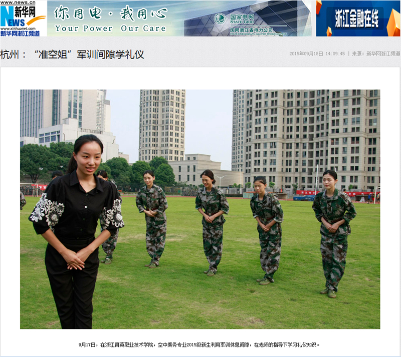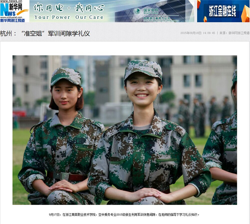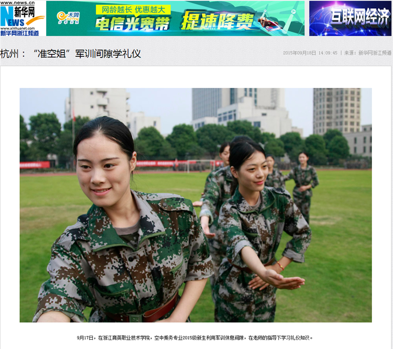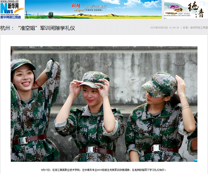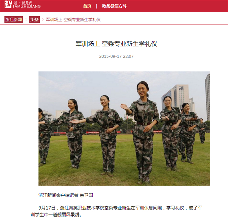 9月17—18日,新华社新华网、中新社中国新闻图片网、浙江新闻客户端头条,报道了我院空乘专业新生军训间隙学礼仪的新闻,浙江在线、钱江晚报、凤凰网、网易新闻等媒体纷纷刊登或转载。