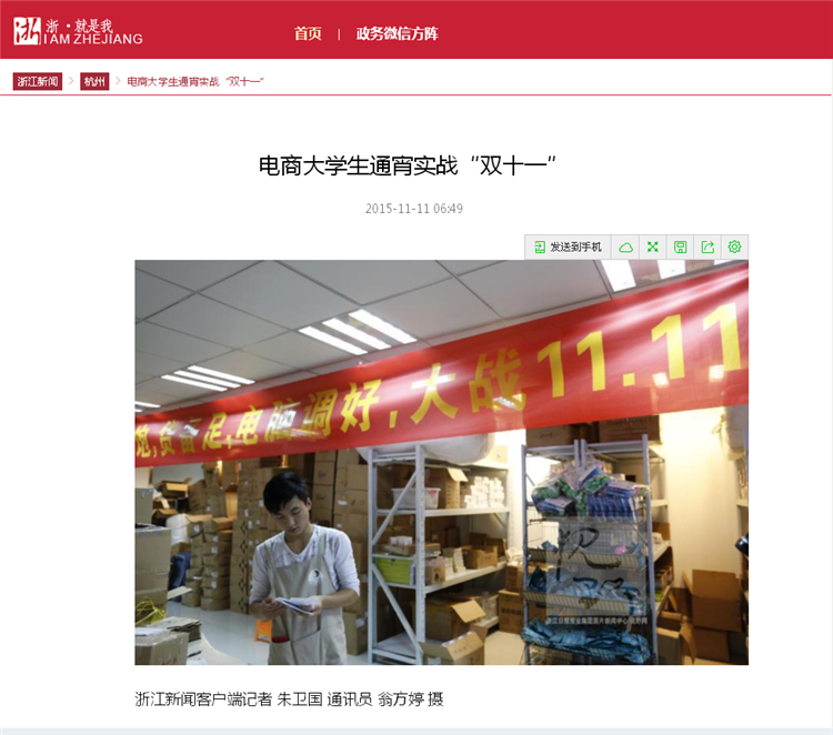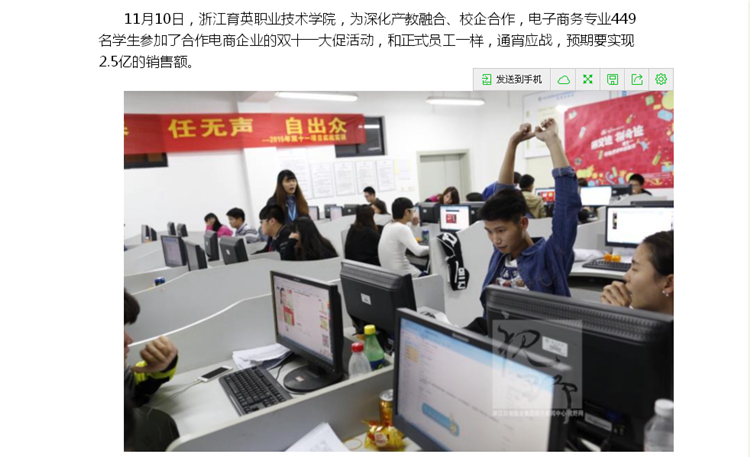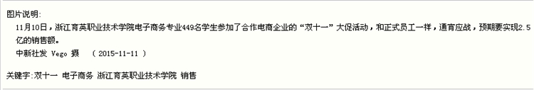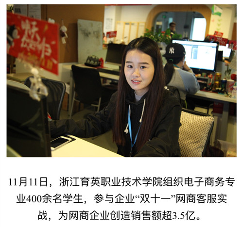 媒体看育英 联系我们 地址:杭州市钱塘区4号大街16号 邮编:310018 电话:0571-86911032、86877189 媒体看育英 当前位置:首页 >> 媒体看育英 新华网、浙江新闻报道我院学生”双十一“专题实战实训 时间:2016-03-02 11月10日-12日,我院商务贸易分院电子商务专业400余名学生参与两家电商企业“双十一”商战的客户服务工作,为企业创销售额超3.5亿元。信息技术分院计算机应用、信息管理、计算机网络专业300余名学生参与企业“双十一”网商大战的数据分析、网络维护和前台接待等工作,为三家企业创4.6亿销售额作出了贡献。新华网、浙江新闻、中国新闻图片网等媒体报道转发学院学生双十一专题实战实训。