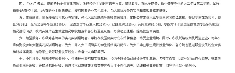 浙江育英职业技术学院根据文经管类专业偏多实际,强化全员就业,加强与政、社、企、行多方合作,促进2016年(含3+2)毕业学生到岗实习和就业,取得显著成效,形成了集中与分散结合、常规与项目结合、线上与线下结合、校内与校外结合、专业与服务结合、应届与下届结合的多种类、多形式、多层次的实习或就业格局。