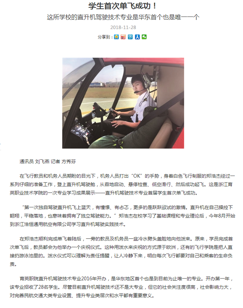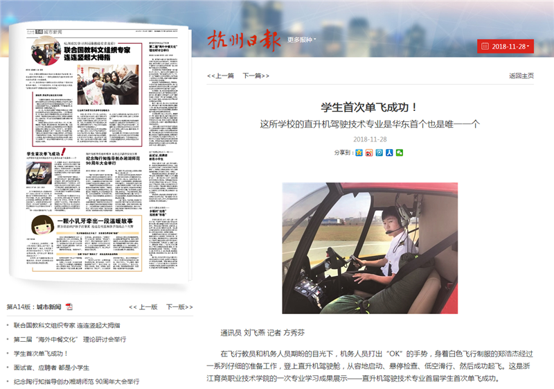 媒体看育英 联系我们 地址:杭州市钱塘区4号大街16号 邮编:310018 电话:0571-86911032、86877189 媒体看育英 当前位置:首页 >> 媒体看育英 【杭州日报、钱江晚报】育英学院直升机驾驶技术专业学生首飞成功 时间:2018-11-29