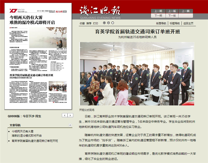 媒体看育英 联系我们 地址:杭州市钱塘区4号大街16号 邮编:310018 电话:0571-86911032、86877189 媒体看育英 当前位置:首页 >> 媒体看育英 【钱江晚报】育英学院首届轨道交通司乘订单班开班 时间:2018-11-30