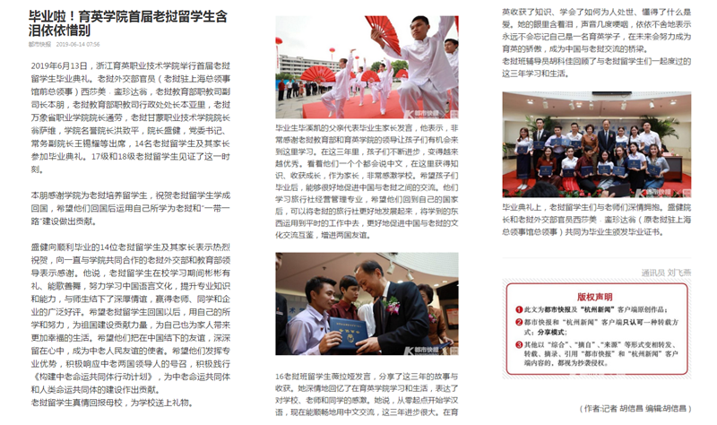 14名老挝留学生及其家长参加毕业典礼。老挝外交部官员西莎美﹒銮珍达翁,和育英学院院长盛健一起,共同为毕业生颁发毕业证书。