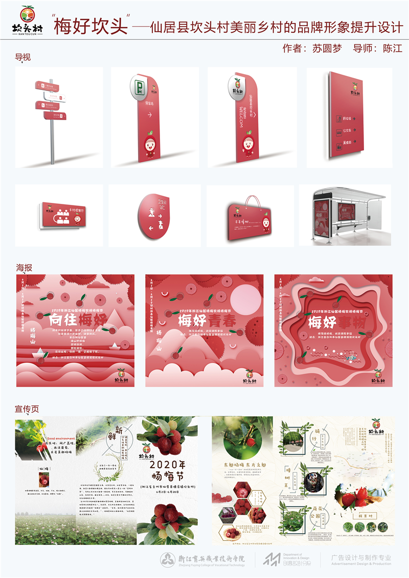 浙江省那么多乡村,为何将毕业作品设计的服务点选在坎头村?王敏燕告诉记者,坎头村地处浙江台州仙居县横溪镇,人称“仙人居住的地方”,是一个以杨梅为龙头的水果之村,是仙居四大杨梅基地之一,2017年被确定为横溪镇精品村建设示范点。2019年底,坎头村与浙江育英职业技术学院创意设计分院的党支部结缘,陈江等4名党员教师带领设计专业的学生走进坎头村,通过深入调研后,确定了将坎头村品牌形象提升设计、村庄景观整治提升设计等作为毕业设计选题,以进一步发挥高校服务社会的职能,助力坎头村美丽乡村建设。
