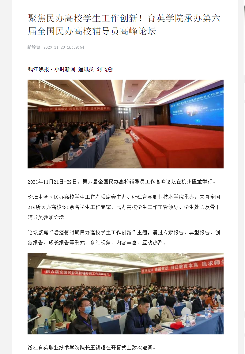 2020年11月21日-22日,第六届全国民办高校辅导员工作高峰论坛在杭州隆重举行。
