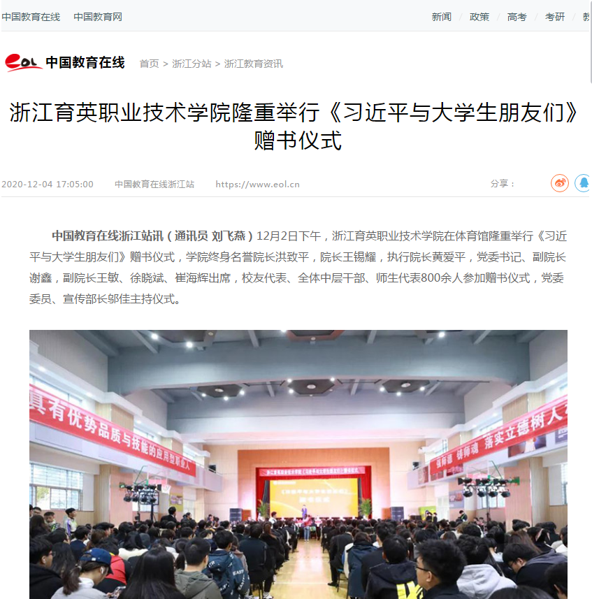 中国教育在线浙江站讯(通讯员 刘飞燕)12月2日下午,浙江育英职业技术学院在体育馆隆重举行《习近平与大学生朋友们》赠书仪式,学院终身名誉院长洪致平,院长王锡耀,执行院长黄爱平,党委书记、副院长谢鑫,副院长王敏、徐晓斌、崔海辉出席,校友代表、全体中层干部、师生代表800余人参加赠书仪式,党委委员、宣传部长邬佳主持仪式。
