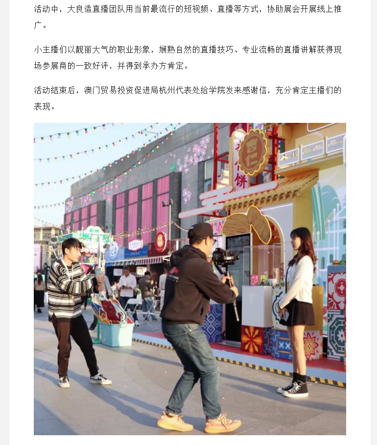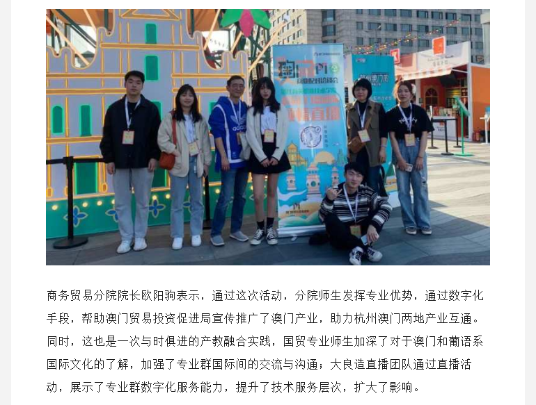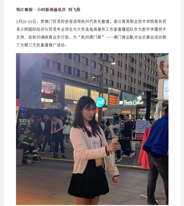 媒体看育英 联系我们 地址:杭州市钱塘区4号大街16号 邮编:310018 电话:0571-86911032、86877189 媒体看育英 当前位置:首页 >> 媒体看育英 【钱江晚报】发挥数字商贸专业优势,这群师生助力杭州澳门产业互通,收到感谢信 时间:2021-04-06