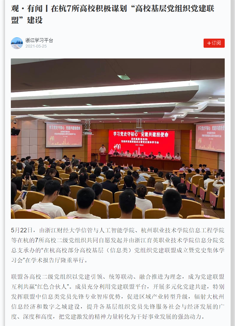 媒体看育英 联系我们 地址:杭州市钱塘区4号大街16号 邮编:310018 电话:0571-86911032、86877189 媒体看育英 当前位置:首页 >> 媒体看育英 【学习强国】观·有闻丨在杭7所高校积极谋划“高校基层党组织党建联盟”建设 时间:2021-05-27