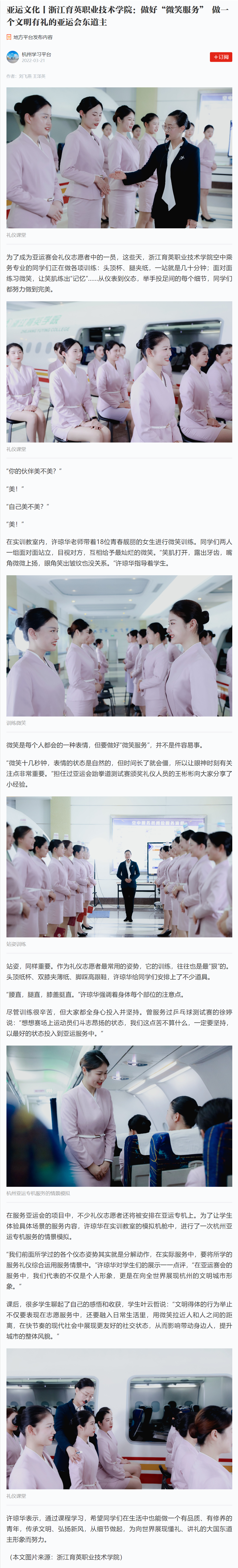 媒体看育英 联系我们 地址:杭州市钱塘区4号大街16号 邮编:310018 电话:0571-86911032、86877189 媒体看育英 当前位置:首页 >> 媒体看育英 【学习强国】亚运文化丨浙江育英职业技术学院:做好“微笑服务” 做一个文明有礼的亚运会东道主 时间:2022-03-30
