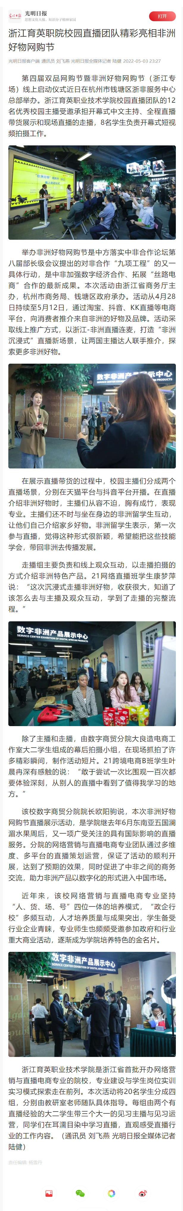 媒体看育英 联系我们 地址:杭州市钱塘区4号大街16号 邮编:310018 电话:0571-86911032、86877189 媒体看育英 当前位置:首页 >> 媒体看育英 【光明日报】浙江育英职院校园直播团队精彩亮相非洲好物网购节 时间:2022-05-04