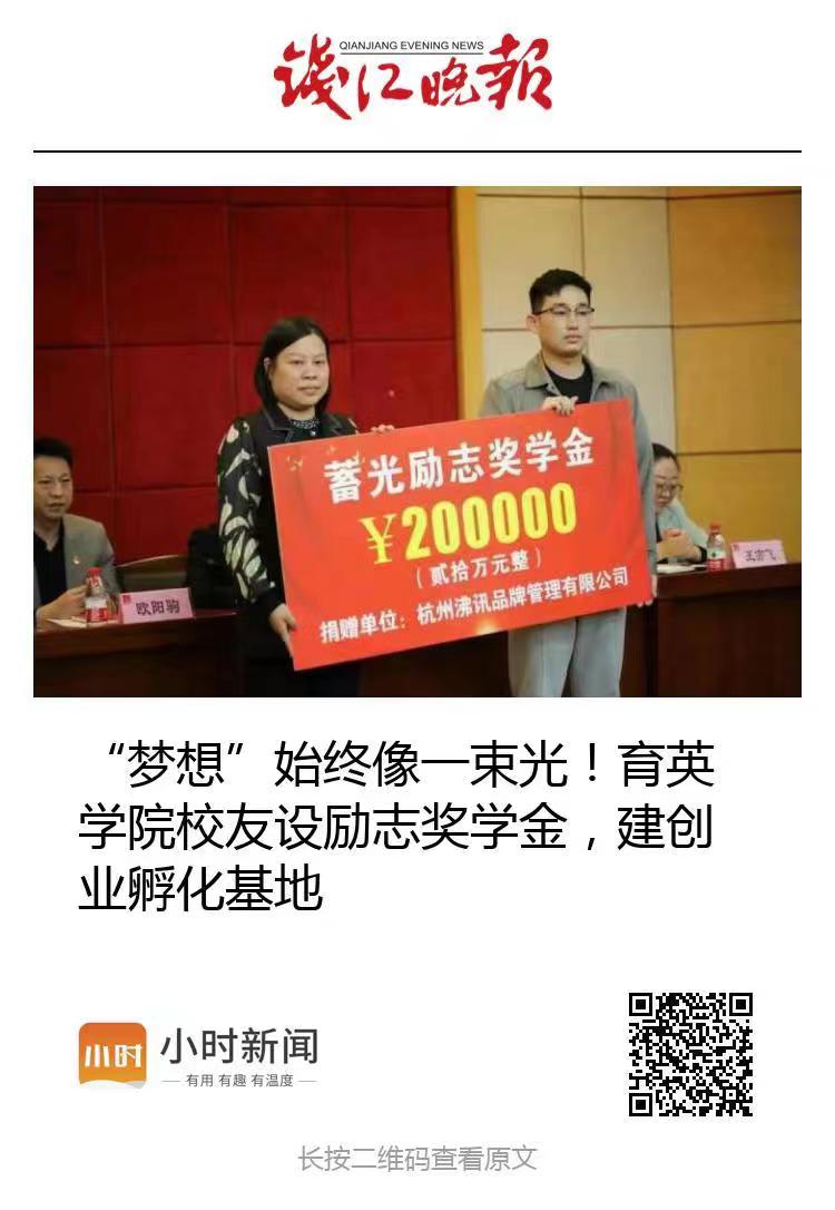 媒体看育英 联系我们 地址:杭州市钱塘区4号大街16号 邮编:310018 电话:0571-86911032、86877189 媒体看育英 当前位置:首页 >> 媒体看育英 【钱江晚报小时新闻】“梦想”始终像一束光!育英学院校友设励志奖学金,建创业孵化基地 时间:2022-10-24