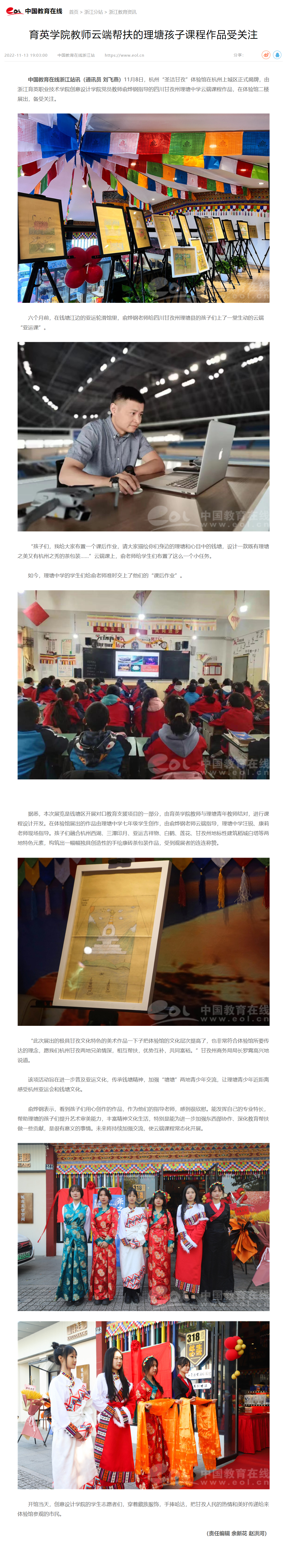 媒体看育英 联系我们 地址:杭州市钱塘区4号大街16号 邮编:310018 电话:0571-86911032、86877189 媒体看育英 当前位置:首页 >> 媒体看育英 【中国教育在线】育英学院教师云端帮扶的理塘孩子课程作品受关注 时间:2022-12-08
