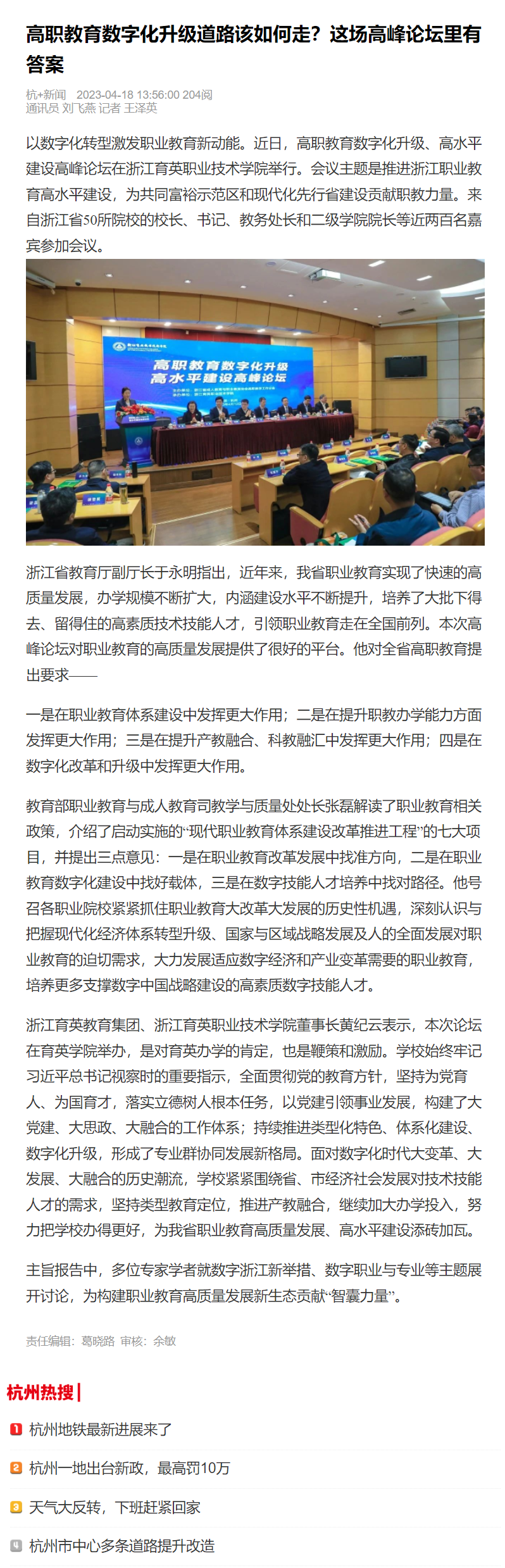 媒体看育英 联系我们 地址:杭州市钱塘区4号大街16号 邮编:310018 电话:0571-86911032、86877189 媒体看育英 当前位置:首页 >> 媒体看育英 【杭+新闻】高职教育数字化升级道路该如何走?这场高峰论坛里有答案 时间:2023-04-18