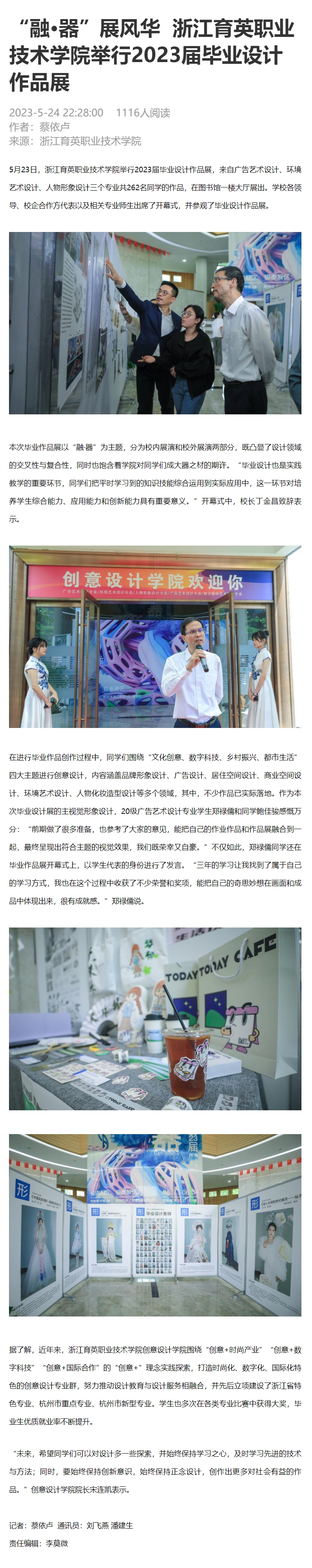 媒体看育英 联系我们 地址:杭州市钱塘区4号大街16号 邮编:310018 电话:0571-86911032、86877189 媒体看育英 当前位置:首页 >> 媒体看育英 【钱塘发布】“融·器”展风华 浙江育英职业技术学院举行2023届毕业设计作品展 时间:2023-05-29