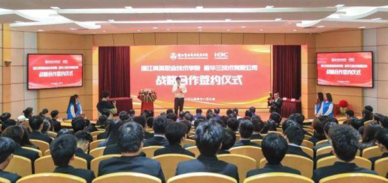 学校校长丁金昌,党委书记、副校长谢鑫,新华三集团副总裁宋凯、人才研学中心教学研究院院长刘朝晖、浙江代表处教育行业部长刘兵、浙江代表处教育行业代表周鑫、人才研学中心校企合作部经理张毅,杭州智炘科技有限公司总经理蔡蕾、副总经理顾海磊,信息技术学院院长严志嘉,党总支书记、副院长李向东,党总支副书记、院长助理徐丹出席,信息技术学院师生代表参加签约仪式。