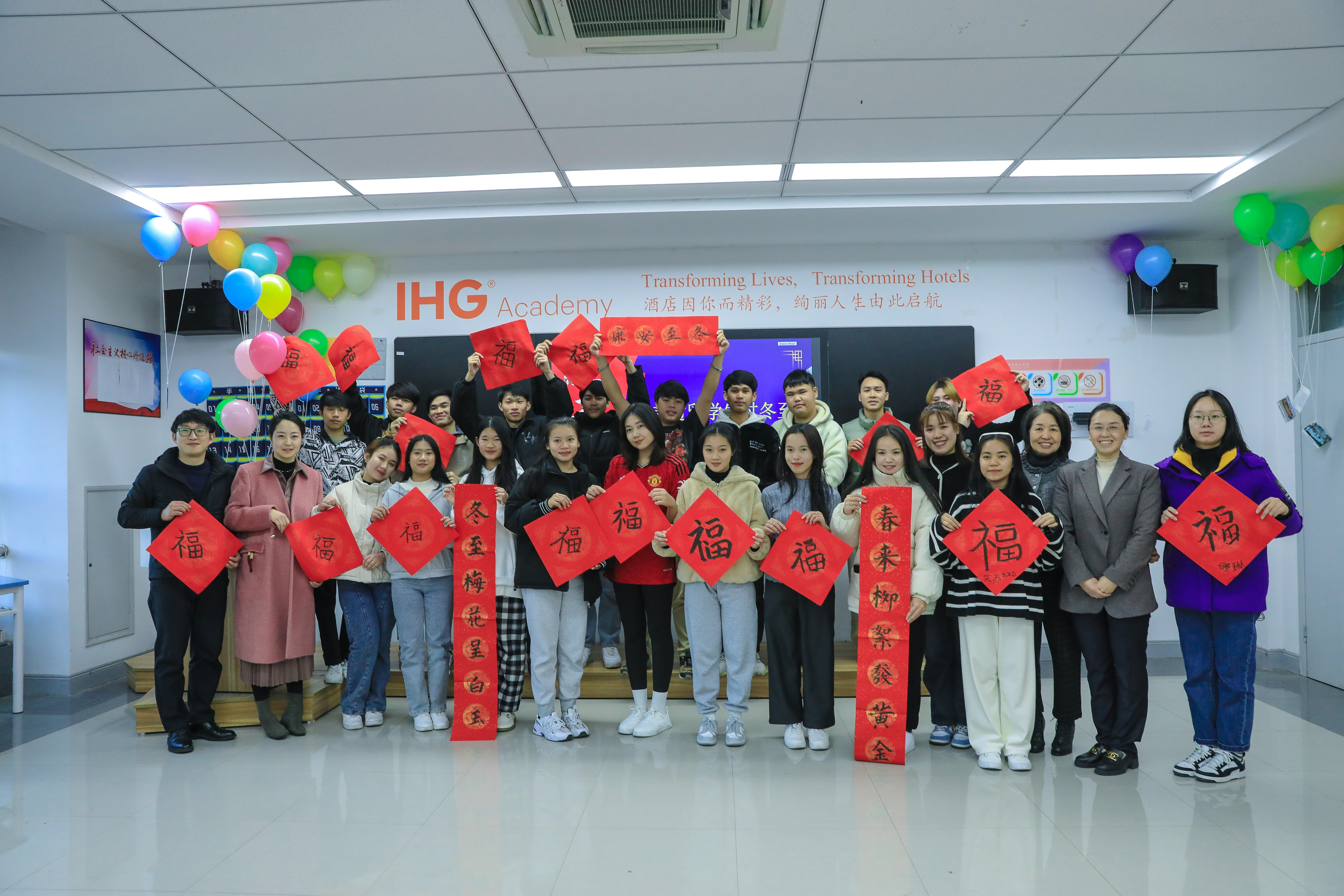 2023级酒店专业19名老挝留学生和14名班助志愿者互赠纪念品,班助们分别带来了自己书写的寓意“福气满满”的96个福字、寓意好运的兔子剪纸、寓意中老友谊“环环相扣”的熊猫钥匙扣,以及棉手套、定制水杯、书签等礼品。教室气球上系着的卡片上写满了老挝留学生对志愿者说的心里话。