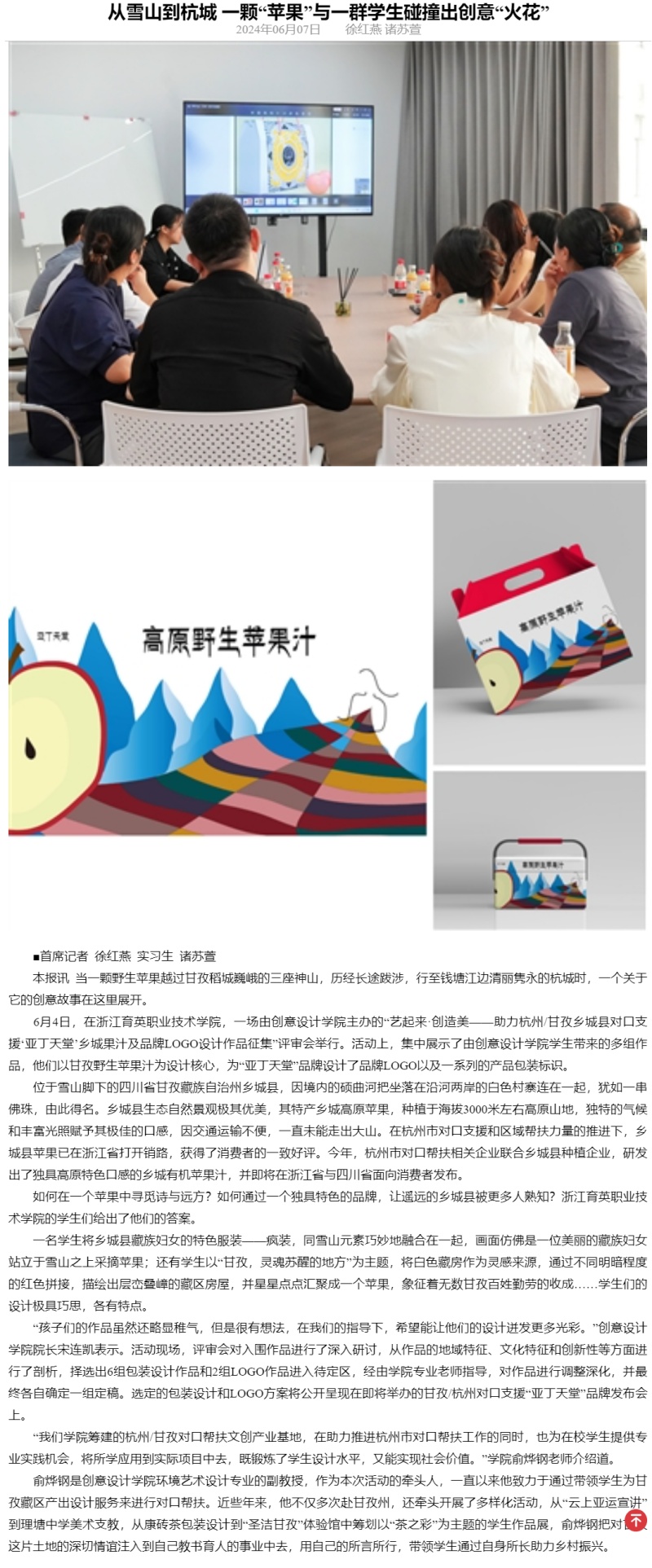 6月4日,在浙江育英职业技术学院,一场由创意设计学院主办的“艺起来·创造美--助力杭州/甘孜乡城县对口支援·亚丁天堂·乡城果汁及品牌LOGO设计作品征集”评审会举行。活动上,集中展示了由创意设计学院学生带来的多组作品,他们以甘孜野生苹果汁为设计核心,为“亚丁天堂”品牌设计了品牌LOGO以及一系列的产品包装标识。位于雪山脚下的四川省甘孜藏族自治州乡城县,因境内的硕曲河把坐落在沿河两岸的白色村寨连在一起,犹如一目佛珠,由此得名。乡城县生态自然景观极其优美,其特产乡城高原苹果,种于海拔3000米左右高原山地,独特的气和丰富光照赋予其极佳的口感,因交通运输不便,一直未能走出大山。在杭州市对口支援和区域帮扶力量的推进下,乡城县苹果已在浙江省打开销路,获得了消费者的一致好评。今年,杭州市对口帮扶相关企业联合乡城县种植企业,研发出了独具高原特色口感的乡城有机苹果汁,并即将在浙江省与四川省面向消费者发布如何在一个苹果中寻觅诗与远方?如何通过一个独具特色的品牌,让遥远的乡城县被更多人熟知?浙江育英职业技术学院的学生们给出了他们的答案。