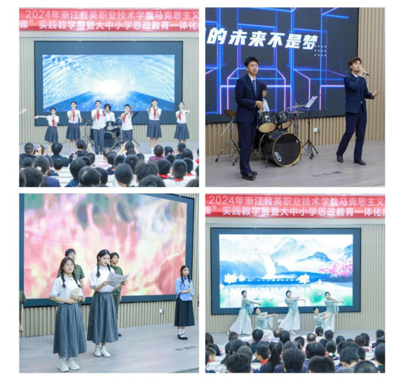 节目展演分为“学思之旅”“践悟之路”和“共筑未来”三个篇章。大中小学生联手,通过歌曲连唱、朗诵等形式表达对新时代的歌颂、对未来的憧憬和对梦想的坚定追求;通过礼仪情景剧展现礼仪在人际交往和文明社会建设中的重要性;通过大学生讲思政课《三大产业历久弥新 宏伟蓝图接力永续》,展示浙江省在“八八战略”指引下取得的辉煌成就,增强同学们对家乡发展的自豪感和责任感;通过古典舞蹈《采薇》展示中华文化的博大精深。
