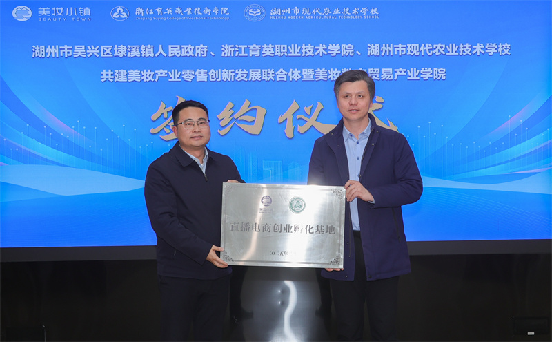浙江育英职业技术学院向埭溪镇美妆小镇授予“美妆数字贸易产业学院”“育英-美妆小镇直播电商创业孵化基地”“美妆小镇产学研育训创合作基地”牌匾。