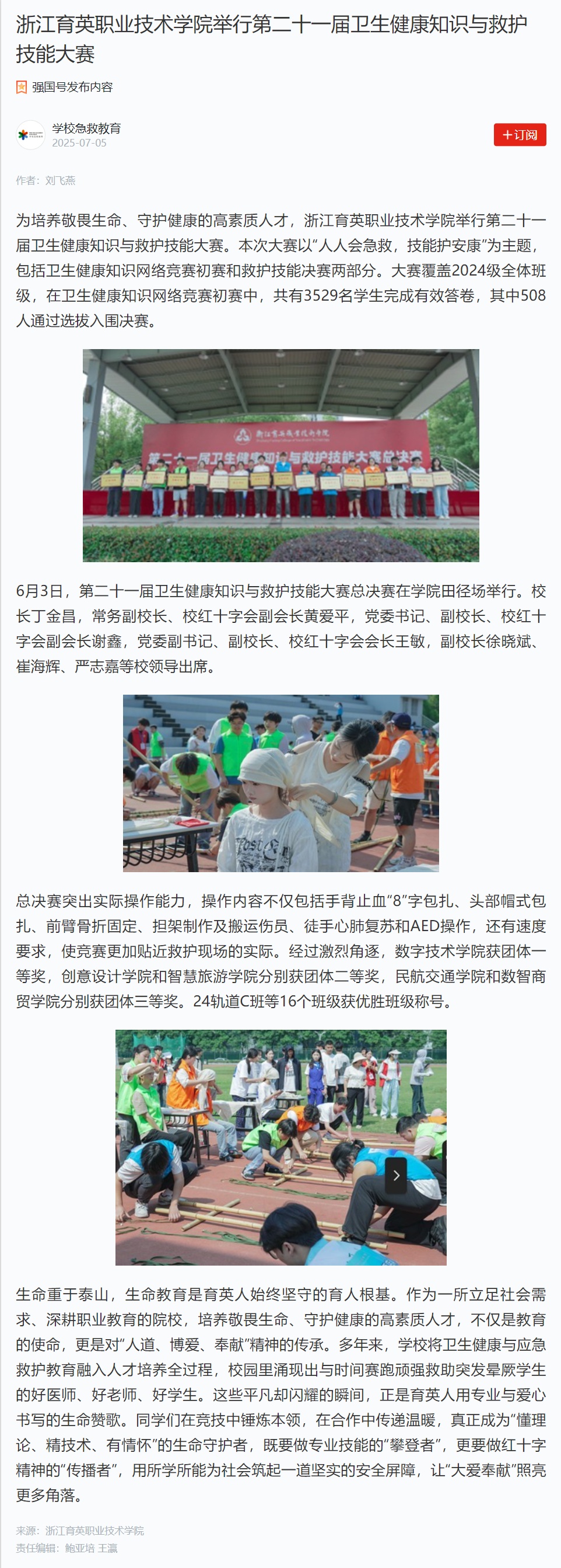 为培养敬畏生命、守护健康的高素质人才,浙江育英职业技术学院举行第二十一届卫生健康知识与救护技能大赛。本次大赛以“人人会急救,技能护安康”为主题,包括卫生健康知识网络竞赛初赛和救护技能决赛两部分。大赛覆盖2024级全体班级,在卫生健康知识网络竞赛初赛中,共有3529名学生完成有效答卷,其中508人通过选拔入围决赛。