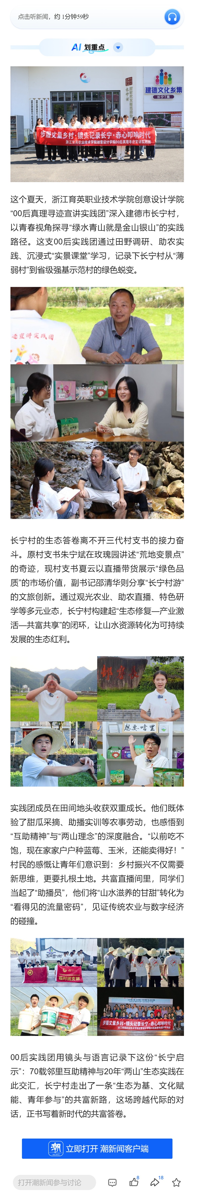 这个夏天,浙江育英职业技术学院创意设计学院“00后真理寻迹宣讲实践团”深入建德市长宁村,以青春视角探寻“绿水青山就是金山银山”的实践路径。这支00后实践团通过田野调研、助农实践、沉浸式“实景课堂”学习,记录下长宁村从“薄弱村”到省级强基示范村的绿色蜕变。