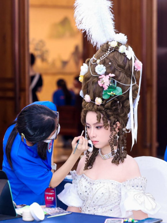 国风造型组一等奖获得者闻艳的作品融合传统与现代风格,将饱满发髻与金钗、花钿搭配,红色眼影点缀其间,让古典韵味与现代美妆艺术碰撞出独特魅力,获得评委高度认可。“为还原唐朝风韵,我查阅了不少古籍画册,备赛时放弃课余休息苦练技术,感谢老师的悉心指导和模特的陪伴与配合。这段经历让我懂得了‘匠心’就是在重复中不断追求卓越。”闻艳说。