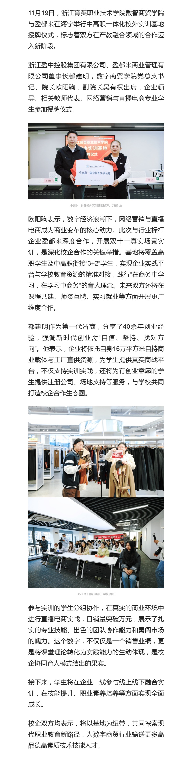 11月19日,浙江育英职业技术学院数智商贸学院与盈都来在海宁举行中高职一体化校外实训基地授牌仪式,标志着双方在产教融合领域的合作迈入新阶段。