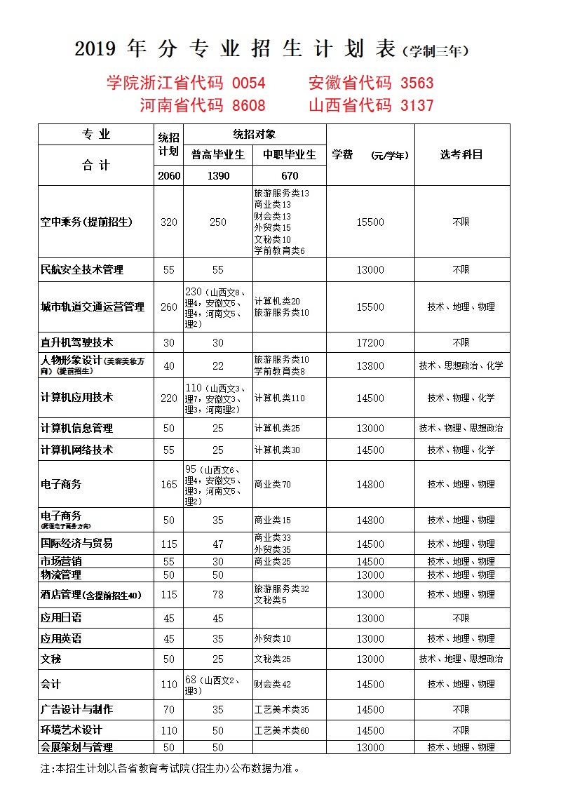 招生咨询 招生公告 报考指南 提前招生 历年分数 2025年招生专栏 录取查询 在线咨询 联系我们 地址:杭州市钱塘区4号大街16号 邮编:310018 电话:0571-86911032、86877189 报考指南 当前位置:首页 >> 招生咨询 >> 报考指南 学院2019年分专业分类别招生计划表 时间:2019-06-11